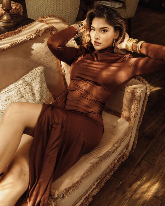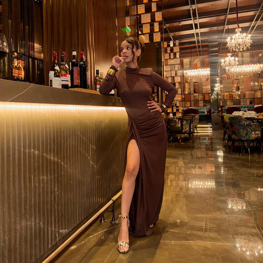 • Alina Statement  Slit Cut Maxi Dress In Brown