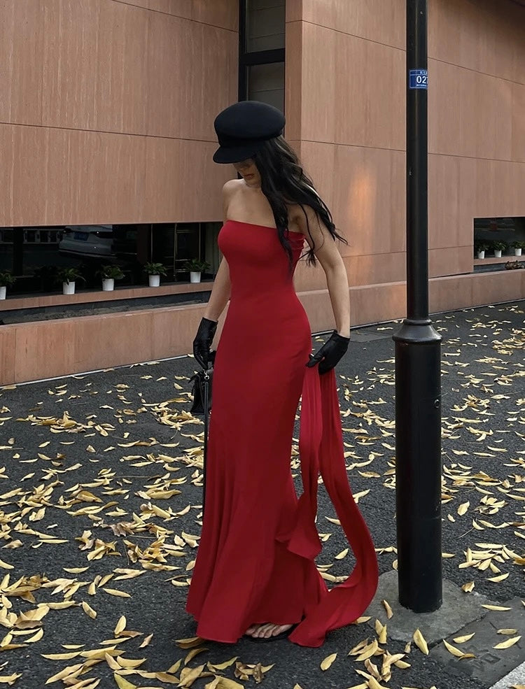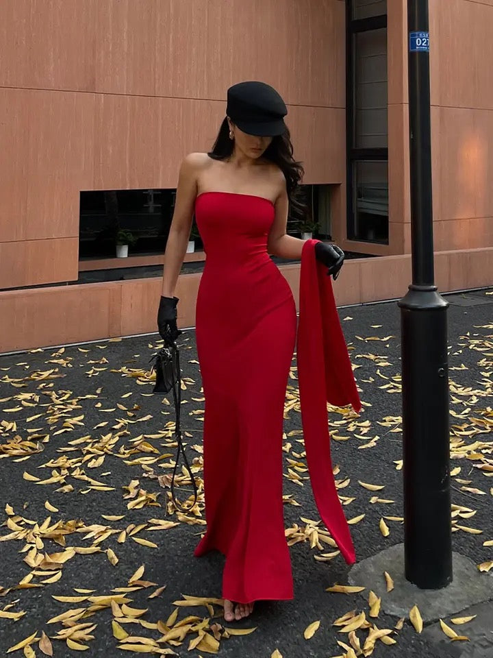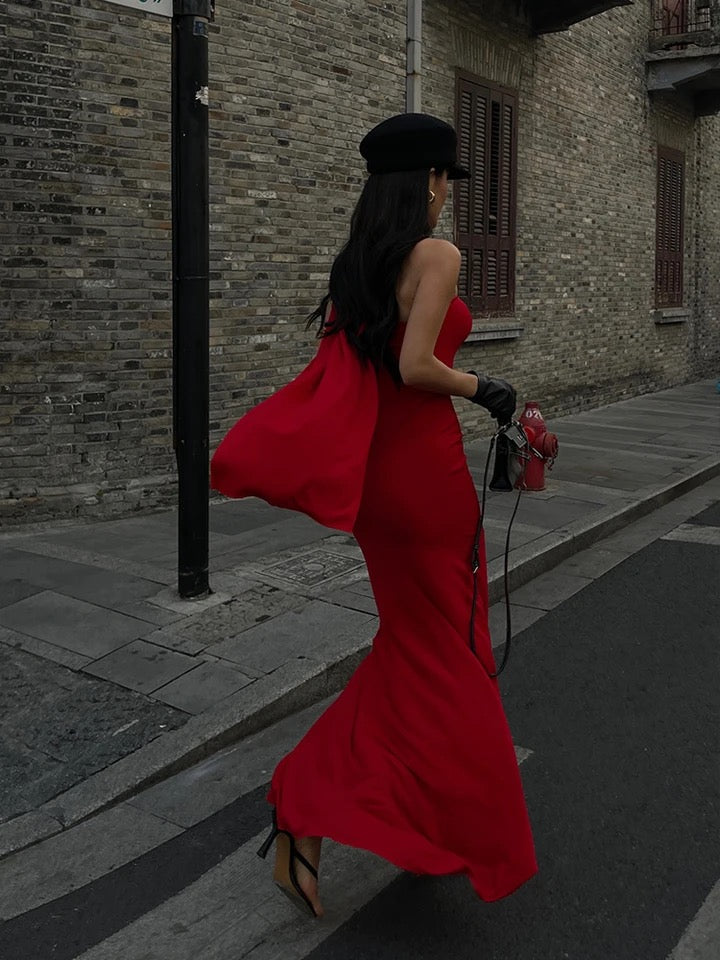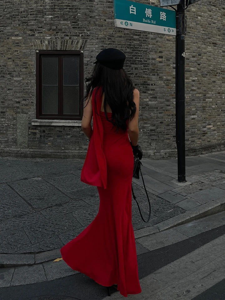 Alamea Offshoulder Statement Dress with Scarf in Red