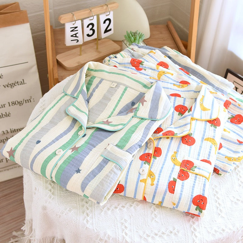 Designed in a relaxed fit, this button-down pajama set features soothing pastel stripes with playful star motifs, adding a fun yet cozy vibe to your bedtime look.
