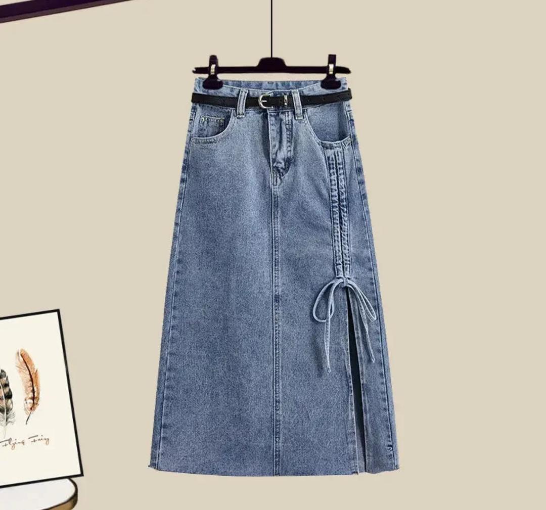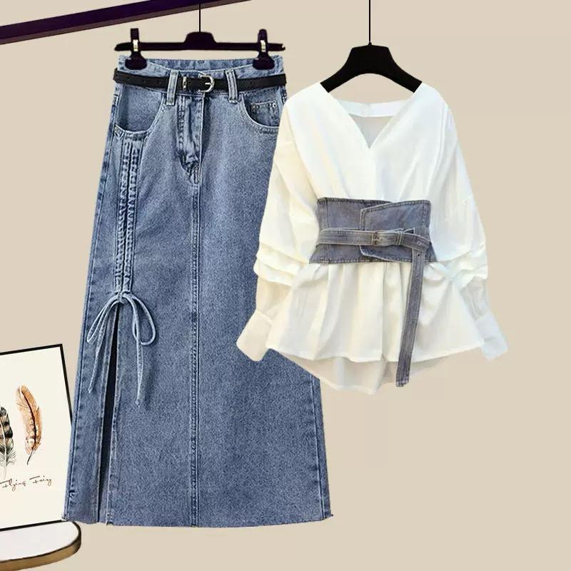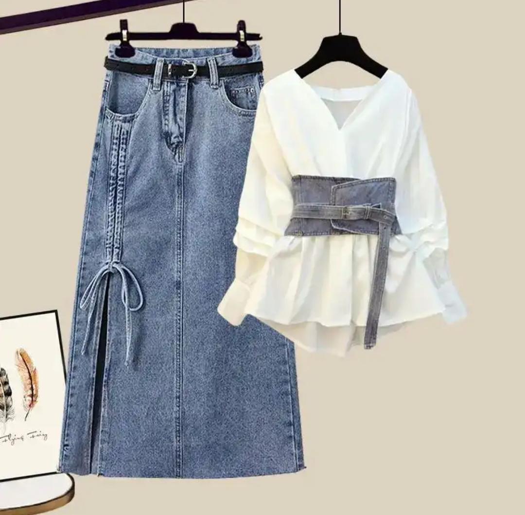 Material : Cotton Blend Shirt and Denim Skirt with Denim Belt