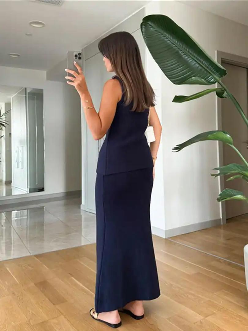 Reeny Luxe Soft Knit Coord Set -Set Of Skirt And Top In Navy Blue