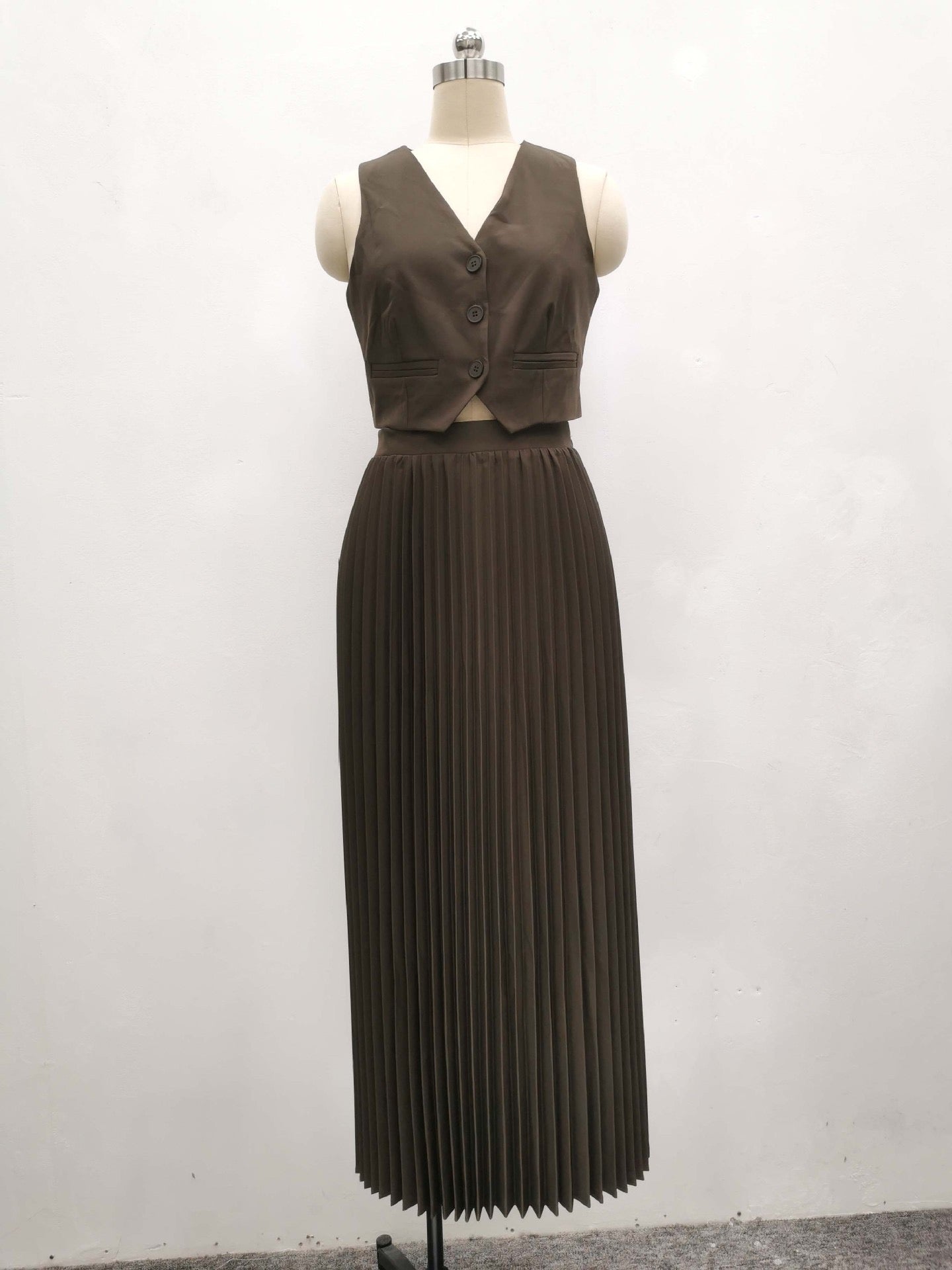 Sarine Luxe Vest Suit With Skirt In Brown